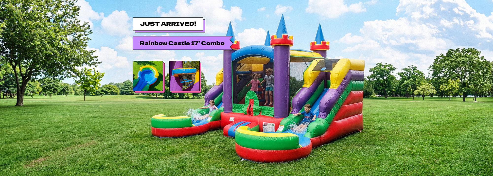 Large bounce area, smooth slide, splash pool, and built-in basketball hoop for nonstop interactive fun.